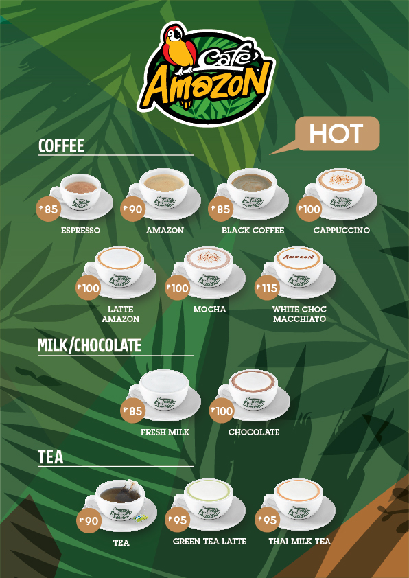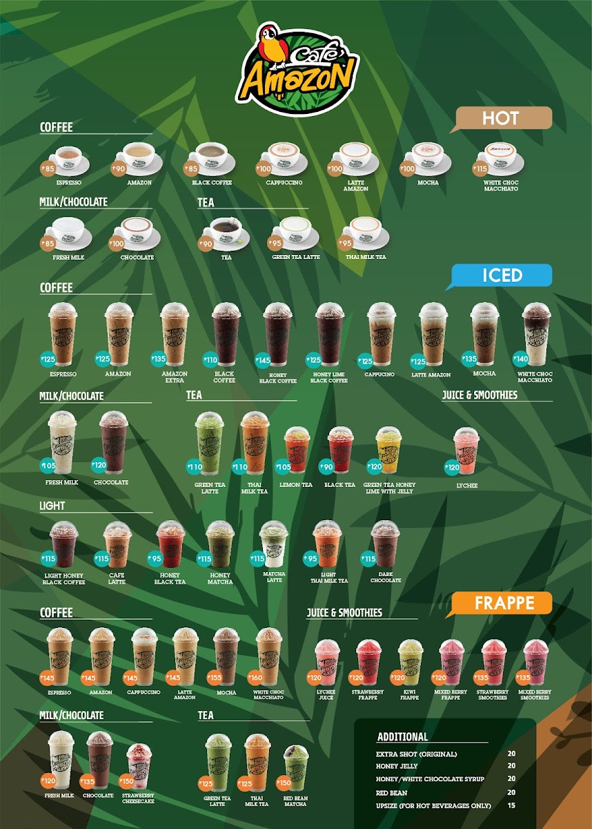 The menu offers an enticing range of beverages, from the bold flavors of Iced Thai Milk Tea and Iced Honey Lime Black Coffee to the creamy indulgence of Amazon Frappe. The Frappes showcase unique blends, like the Thai Milk Tea Frappe and the Green Tea Latte Frappe, all crafted from authentic ingredients.